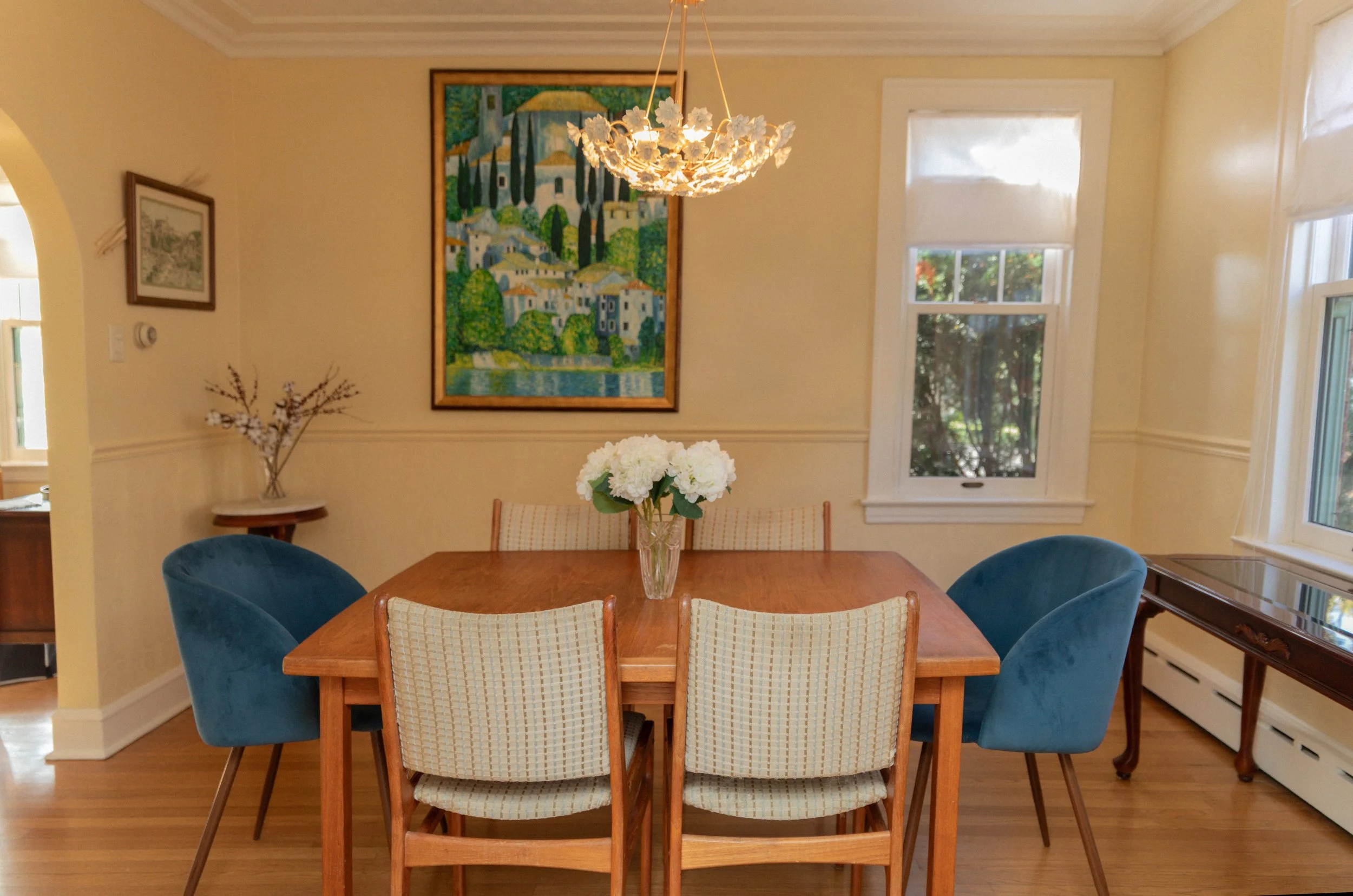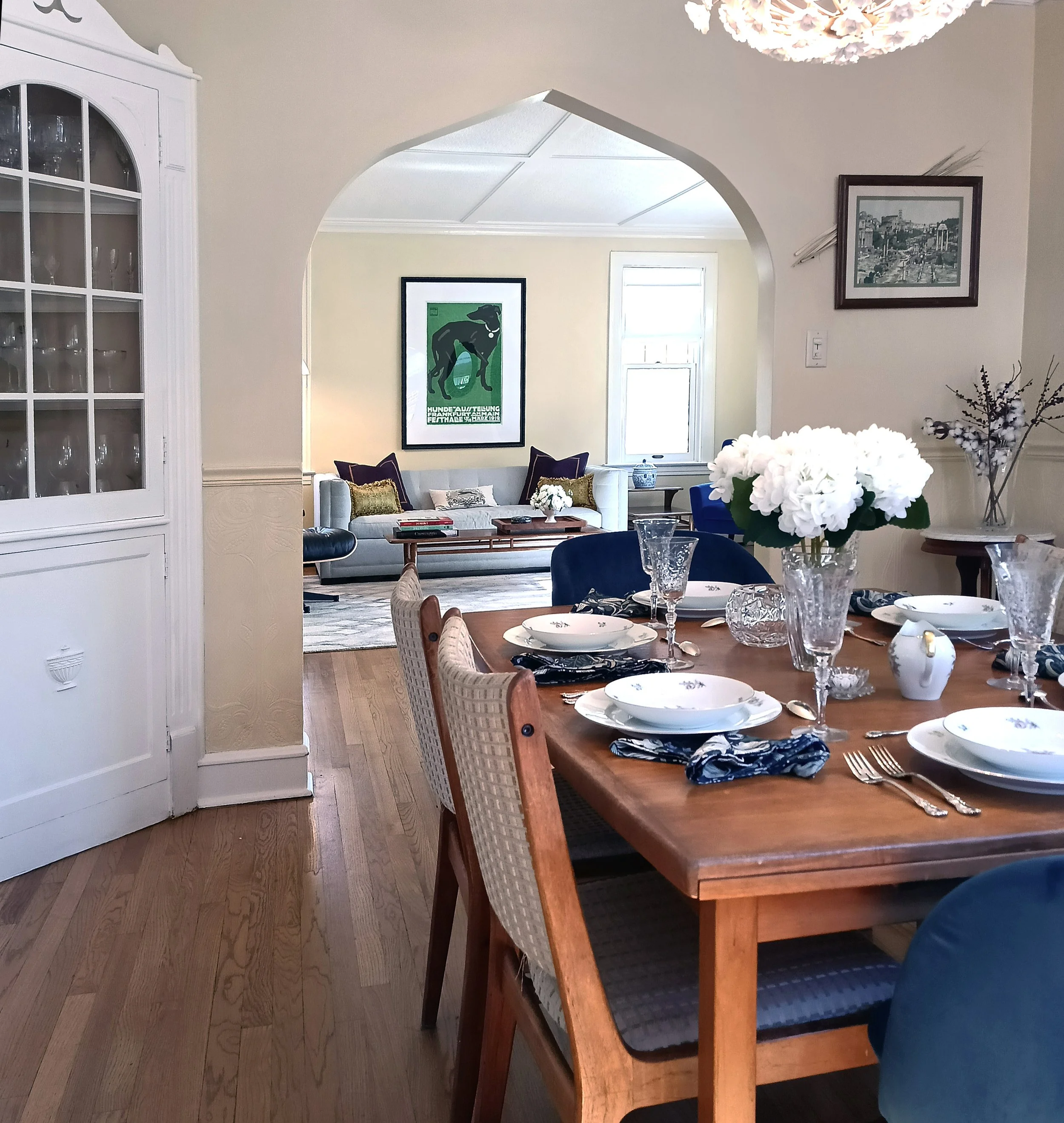 The Moorish arch connects the living room and the dining room. The Farrow & Ball Farrow Cream paint color unify the two spaces.