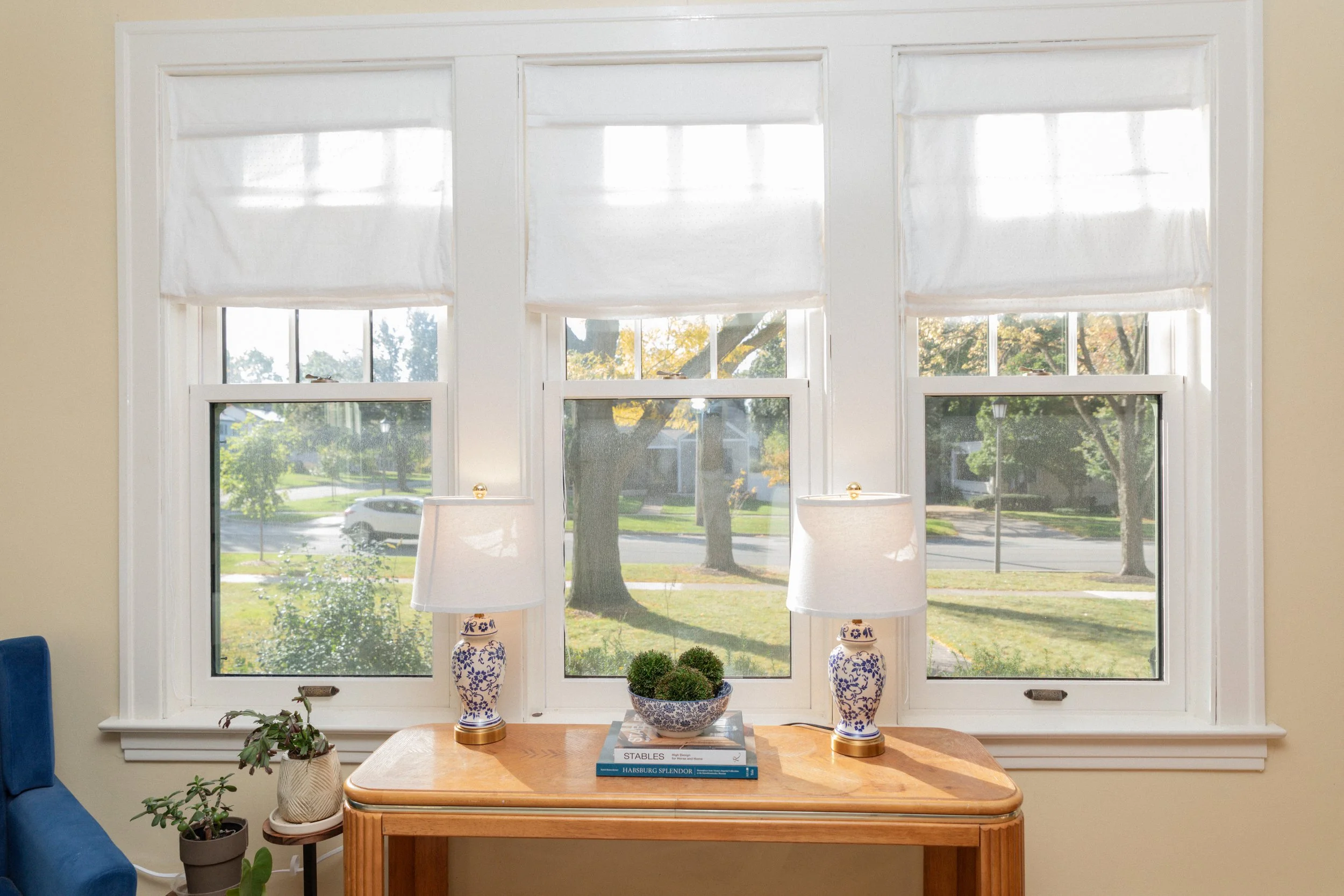 The house sits on sunny corner lot, flooding the living room with beautiful natural light. The soft yellow of Farrow & Ball’s Farrow Cream warms the room, diffusing the light as it filters through the custom Swiss dot Roman shades.