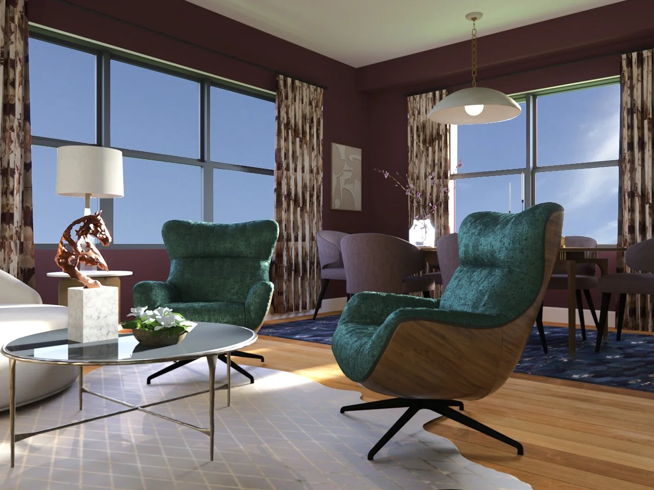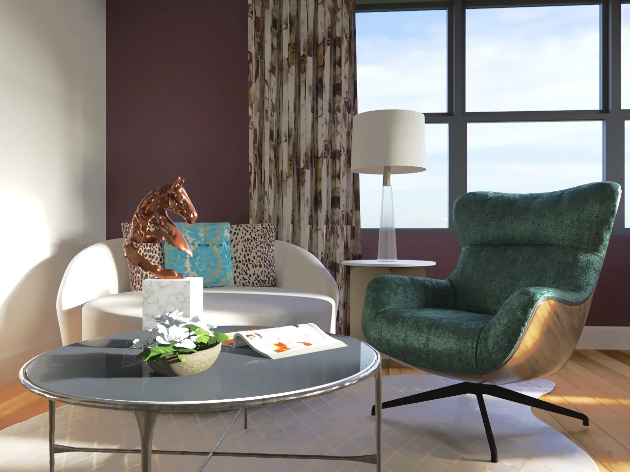 Sophistication with overtones of glamour describes the owner’s style. Oversize rounded furniture create the perfect place to curl up with a magazine, or catch up with friends. Art Deco accents sparkle in the Art Hide rug with copper accents and the Olsen Lamp.