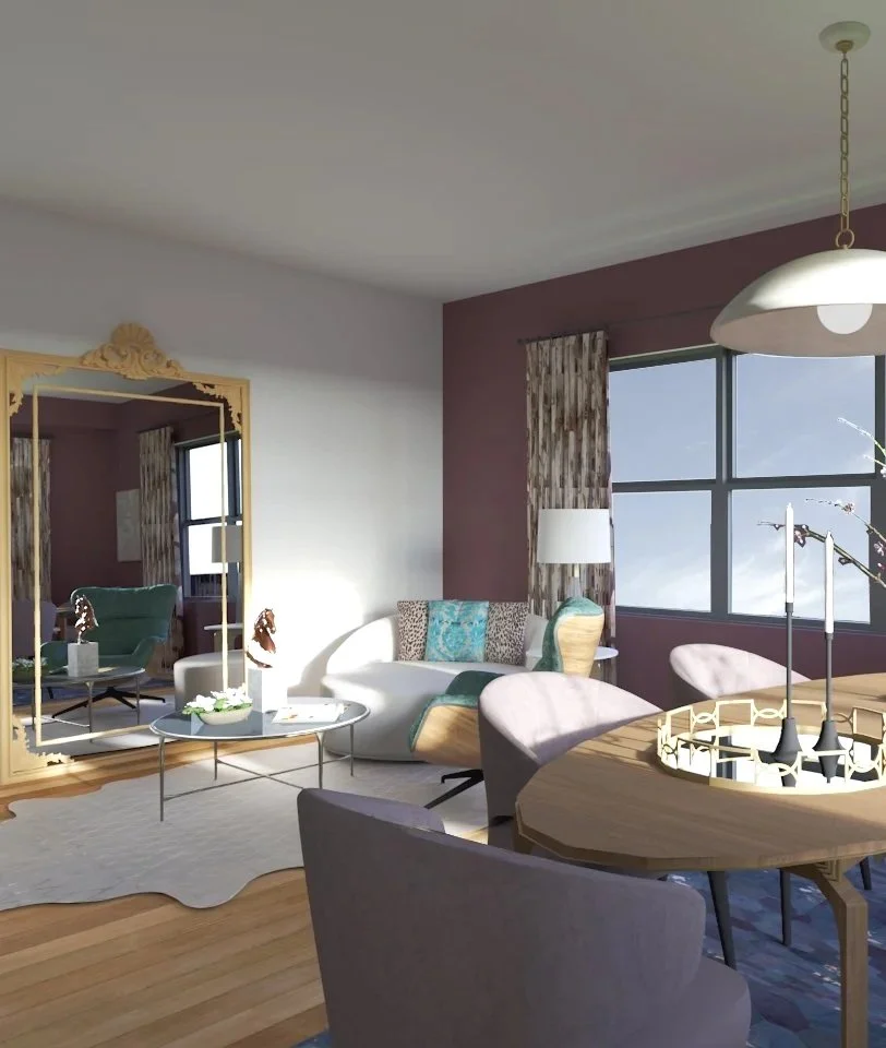Light is layered in the combined living and dining areas. A pendant over the dining table, a table lamp in the seating areas, large windows and a large, ornate mirror which captures the light and illuminates the seating area give depth to living space.