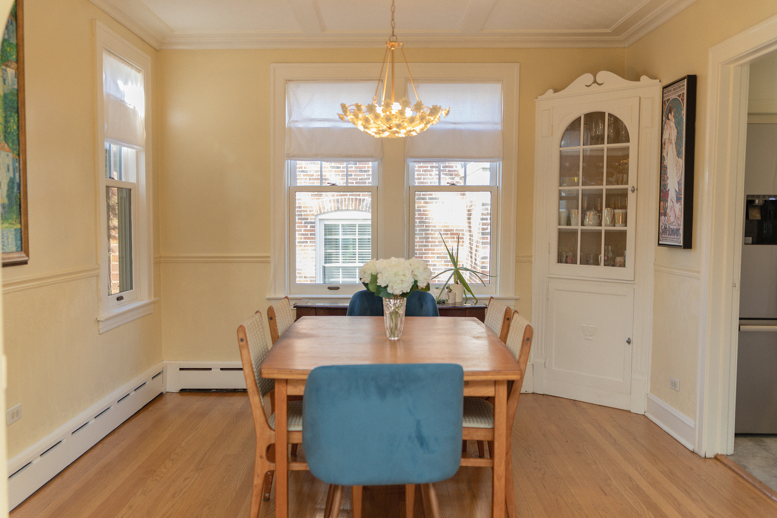 Built in cabinetry and art nouveau patterns give a richness and sophistication to this 1920s dining room.